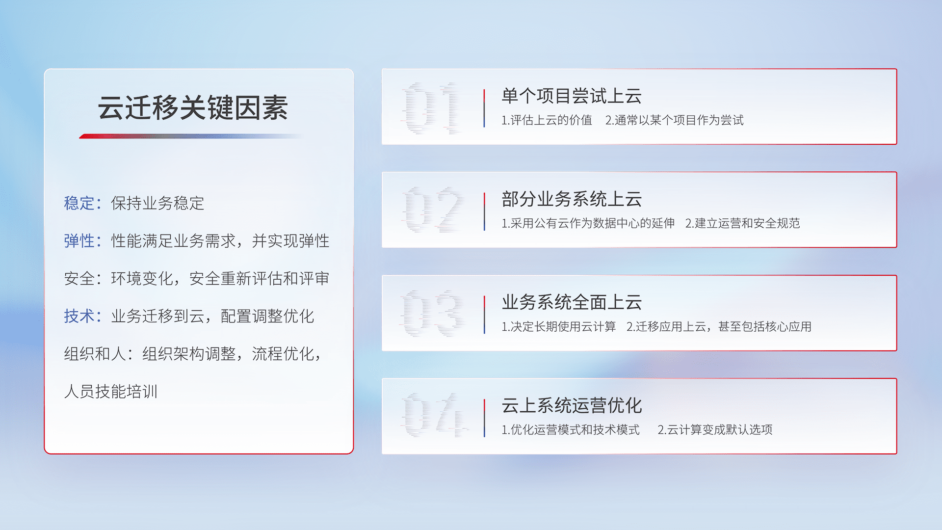 结合实际业务,,从规划设计、、、云平台选型、、云原生改造、、数据迁移、、集成交付,,,迁移全过程为客户识别最佳上云路径,,做好风险识别管理,,,,设计网络架构、、身份权限、、安全审计合规、、操作审计、、、、日志审计、、、、监控告警策略、、、多站点容灾设计等,,,,对云上基础设施进行整体规划,,,提升IT治理水平,,,以满足弹性、、高可用、、高性能的需求。。