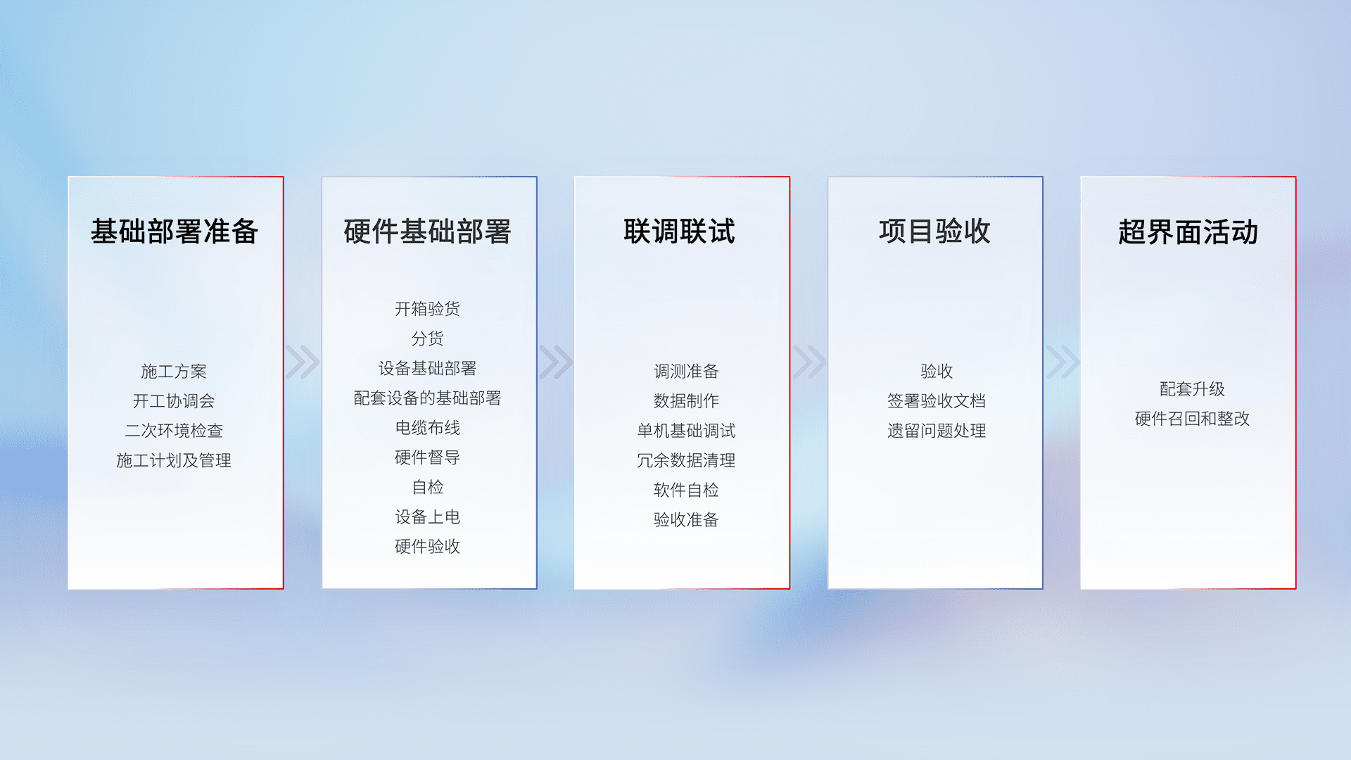 从基础部署准备、、、硬件基础部署、、、、联调联试、、项目验收、、、越界面活动的全过程可追溯,,,保证施工质量和进度。。。。